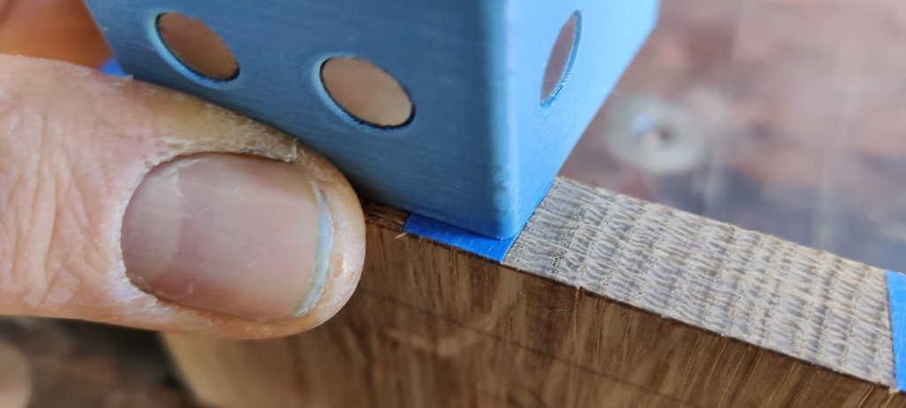 Once you've cut the tails and transferred the marks onto your pin board, you can use the other two sides of the jig to ensure you cut the pins at the correct angle and straight down. This photo shows how you line up the jig for cutting tails (here I've used masking tape before transferring the cut positions from the tail board: the masking tape makes it easy to see where the line is).