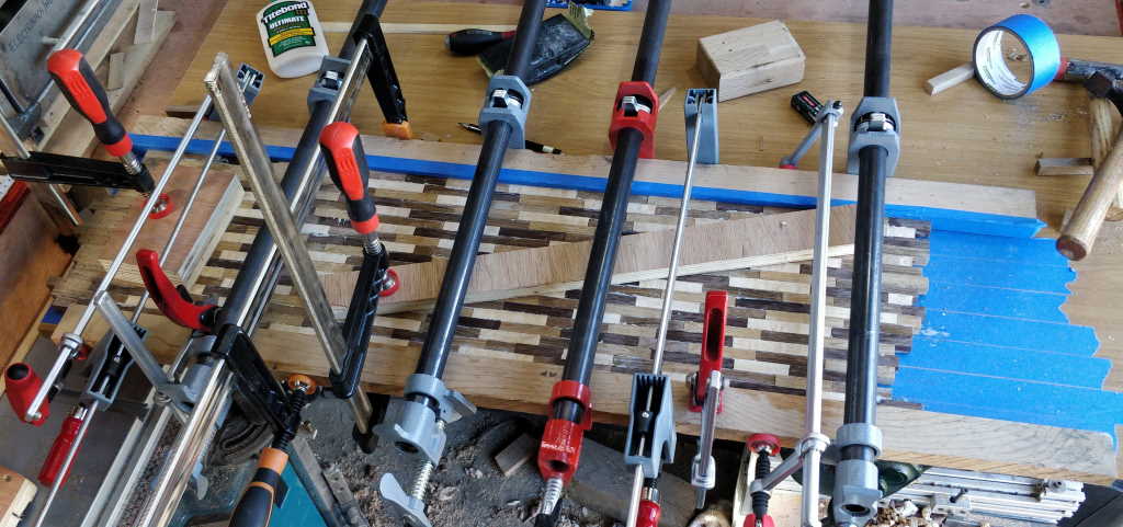 Once all the rows were in place, I placed another piece of wood on the side nearest me and started applying clamps. I used a scrap of wood diagonally across the assembly to stop the pieces springing up and used a soft-faced hammer and another offcut piece to tap each row from the right-hand end to make sure the pieces were firmly together and up against the left-hand end stop. Finally, I added lots more clamps and left the glue to dry.