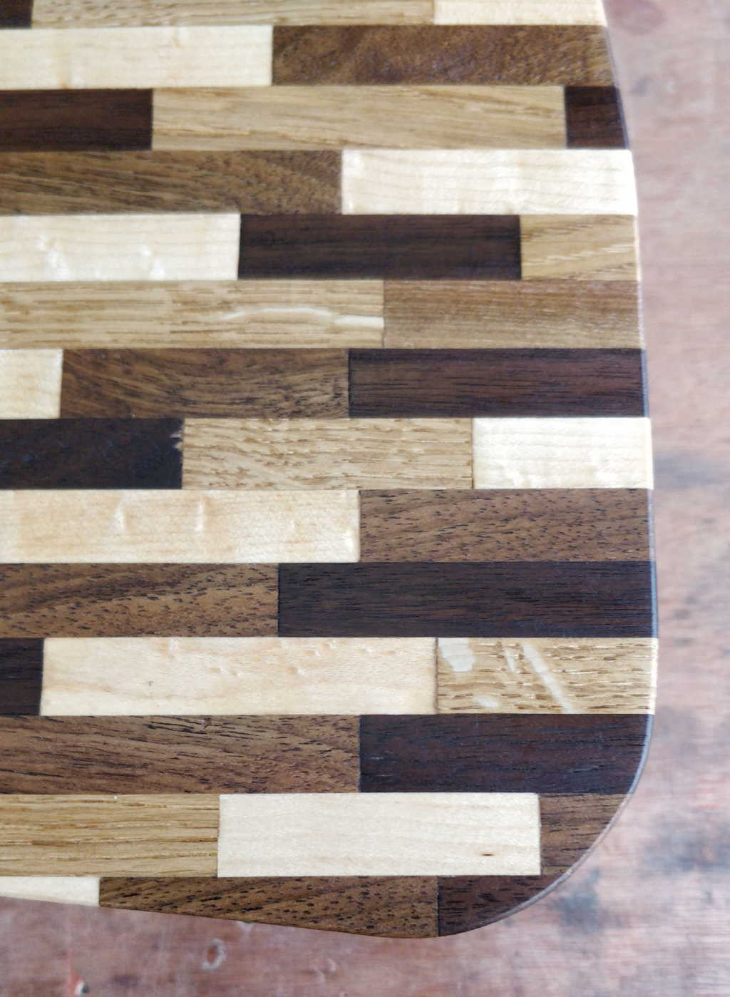 This is a monitor stand (for two widescreen monitors) that I made out of lots of offcuts of four different woods: Oak, Maple, European Walnut and American Black Walnut. The legs are made from stainless steel and splayed out at 15° from vertical. There is a support frame of thin stainless steel sheet set into the wooden top and a cross-bar made out of square stainless steel bar at the front behind (and attached to) the front legs. The feet have self-adhesive felt on the bottom to stop them from scratching the desk on which the stand is placed.