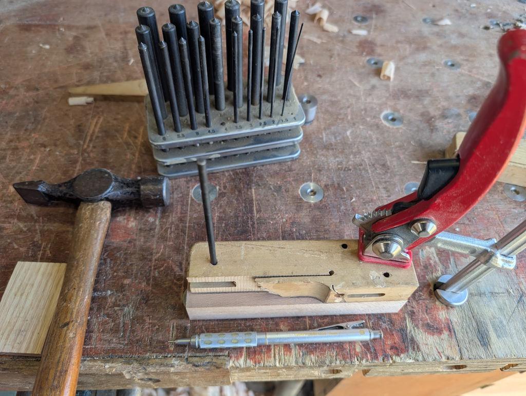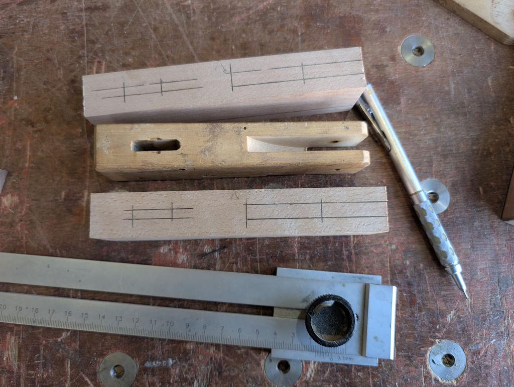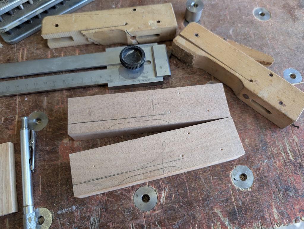 The first thing I did was clamp the broken piece onto each of the beech blocks and use some transfer punches to transfer the positions of the roll pin holes and the relief hole at the bottom of the slit. I also drew round what was left of the body: