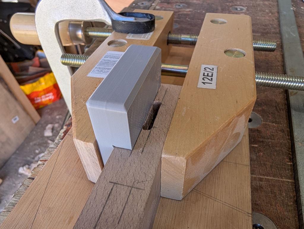 Taking advantage of the fact that my new-ish 3D-printer is much faster than the old one and can knock something like this up in a little over 20 minutes, I printed a little paring guide and used it with an 18 mm chisel to widen the slot: