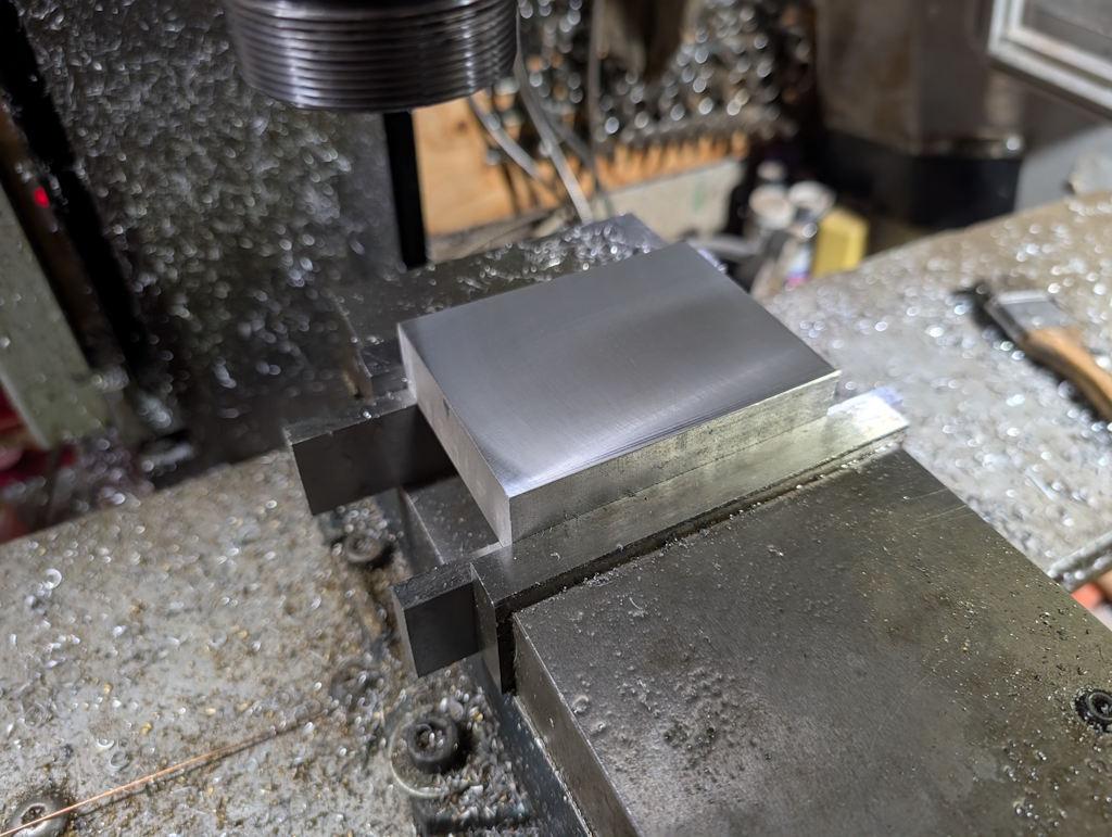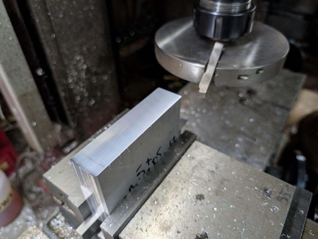 Next up was the lid, which is going to be made from a big lump of aluminium I found in the skip. The aluminium block was much too large so the first job was to cut a bit under half of it off in the bandsaw. The cut-off bit then got mounted in the mill vice and I used my big flywheel fly cutter to clean up all the faces and bring it to the target dimension. In progress shot: