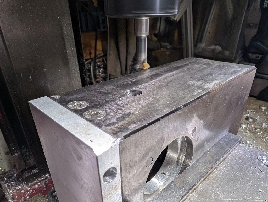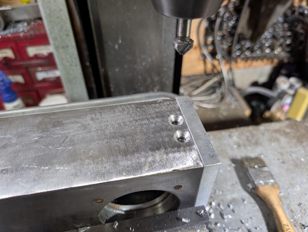 The front got two holes, a big one for the tommy bar (which I drilled 10 mm then finished with an end mill as I couldn't get the head up high enough to leave clearance for my 12 mm drill bit) and a smaller one to mount the cover for the big hole: