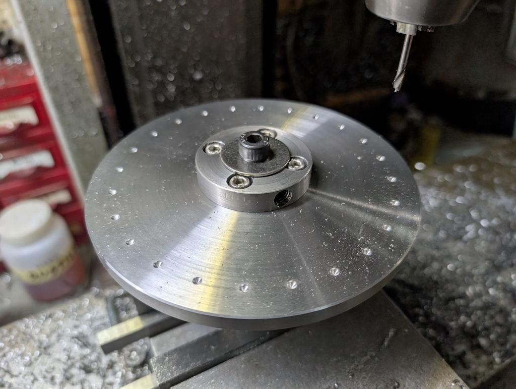 In that photo I'm parting off the bit that hasn't had any turning done on it. That "jig" got held in a collet chuck and the workpiece got clamped down to it. I then used the "PCD" (pitch circle diameter) function of the digital read-out, in combination with an 3 mm spotting drill, to mark out 24 holes, evenly spaced around the outside (on a 120 mm diameter):