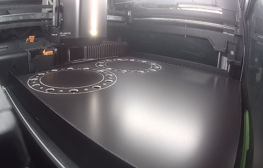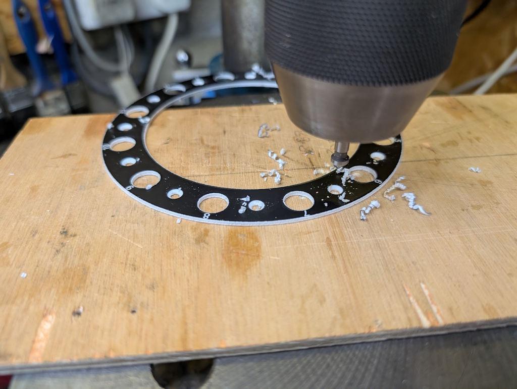 I used the pillar drill with a countersink bit to deburr the reverse side of the part and then used the laser function of my new-ish 3D-printer to engrave and cut out two mirrored pieces from some 1.6 mm thick black-on-white laser laminate: