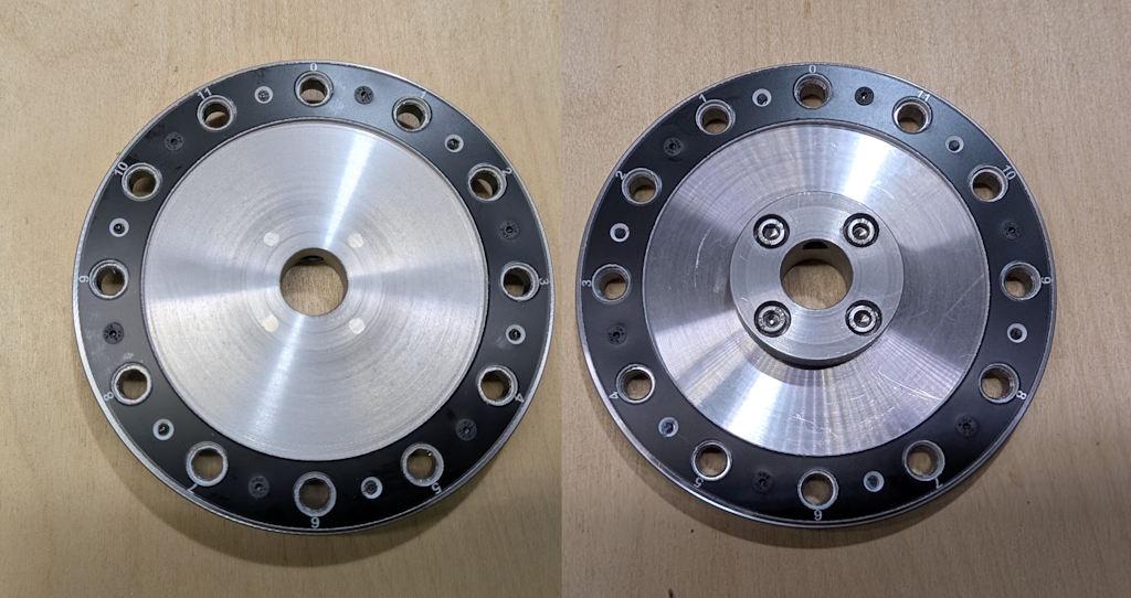 In case you haven't already guessed what this is for, this is a dividing attachment for the lathe. It'll get mounted on the rear of the spindle. There will be a sliding bar in the new lid of the headstock (using one of the two holes I drilled in the lid that had to be 60 mm from the spindle axis) that will (hopefully) slide into the holes on this dividing plate and will lock the spindle's rotation, allowing me to add features that are evenly spaced around a turned part.