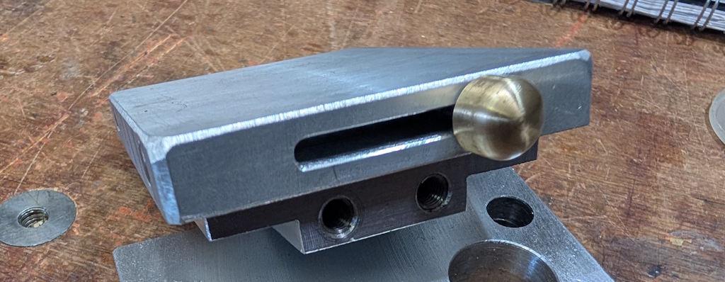 It gets screwed into the threaded cross-hole in that bit of 8 mm silver steel. I tightened it in place using an ER32 collet block to grip on the outside of the brass. All being well, it won't have to be undone. Those two bits get fixed together in the lid, thus: