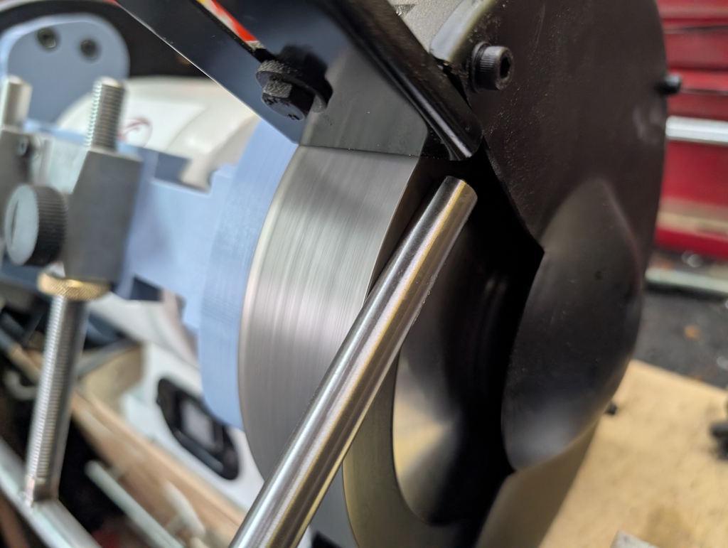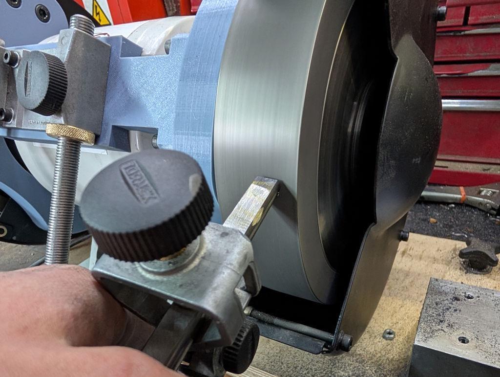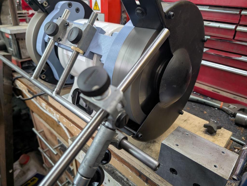 Having recently finished a series of upgrades to my medium-speed bench grinder, it seemed good to have an opportunity to use it to shape a tool from scratch. I'd purchased some 12 mm diameter 300 mm long high-speed steel (HSS) round bar from aliexpress, so I put a piece of that in one of the Tormek jigs and used the side of the coarse (80 grit) CBN wheel to grind a flat on it at a slight angle to the axis of the tool: