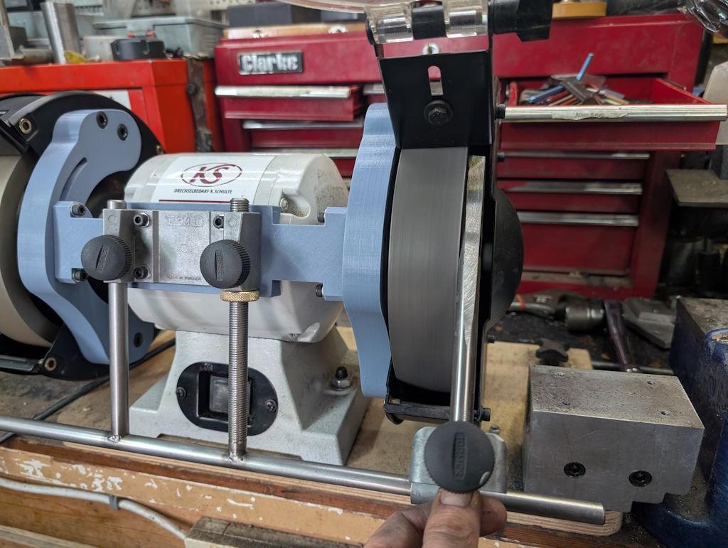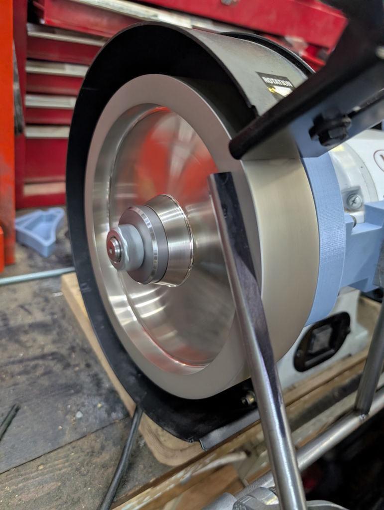 To smooth out the result of that coarse grind, I took it over to the 180 grit side of the bench grinder. There wasn't quite enough clearance for the HSS bar to squeeze between the grinding wheel and the cover, so I had to take the cover off to do this (which is perfectly safe with a CBN wheel and which was very quick and easy thanks to the rivnut-and-cap-screw modification I made to the grinder):