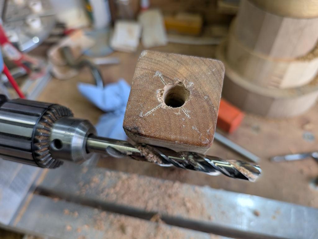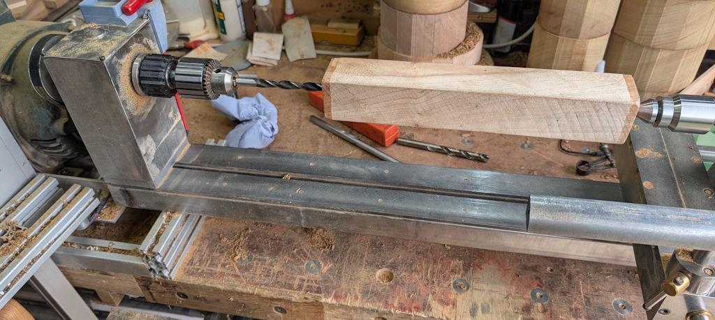 With that, the tool was done and I just needed to make a handle. I started with a bit of sycamore and drilled out the centre, initially using a 10 mm spur bit: