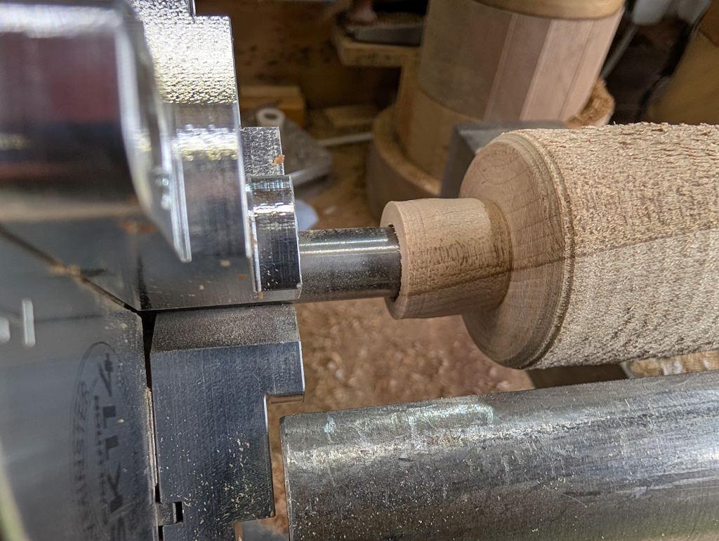 After roughing it round, I carefully reduced the size of the end down until it measured a fraction over 20 mm (which is the inside diameter of some home-made ferrules I made a while ago):