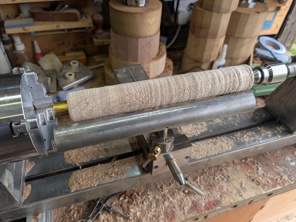 With the tailstock support still there, I sanded it, starting at 120 grit and going up to 320 grit. I tried to take a photo after sanding but got the focus wrong: